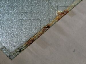 窓サッシなどガラスをグレチャン(コの字型ゴム)で施工したガラス下部の状況