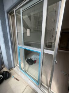 名古屋市北区マンションスペーシア網入り透明へ交換させていただきました。ガラス総厚10㎜コーキング施工