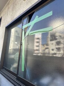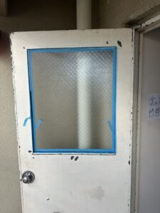マンション1階網入型ガラス6.8㎜1164 × 1000コーキング施工
