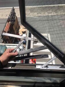 北名古屋市の会社様事務所縦辷り出し窓の障子が落下しそうなので修理またはサッシを交換したいとのご相談をいただきました。25年以上前のトステムのフロントサッシですが写真ステー部品の障子を支える重要な部分が上下共破損したのが原 […]