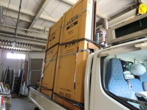 木造新築物件へのサッシ・ガラス納品2世帯住宅になりますので玄関は2セットあります。こちらのハウスメーカー様は1棟分の枠、ガラス全部1回で搬入します。