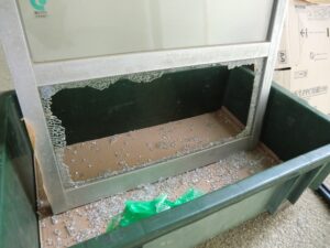 近くの学校様より強化ガラスの割れ替え修理のご依頼をいただきました。10日程納期が掛かりますのでベニヤ板を嵌め込み養生させていただきました。 コーキングを施し無事お引渡しできました。