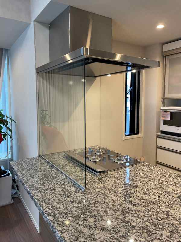 既設で高さ30㎝程のオイルガードは付いておりましたが低い為、全面ガラスパネルへ交換させていただきました。