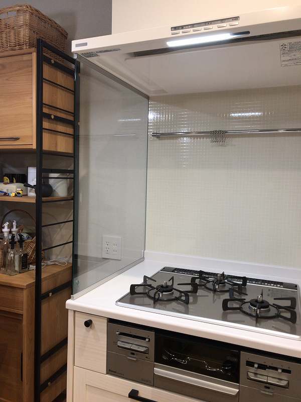 今回はコンロ側面に全面ガラスパネルのオイルガードを取り付けさせていただきました。