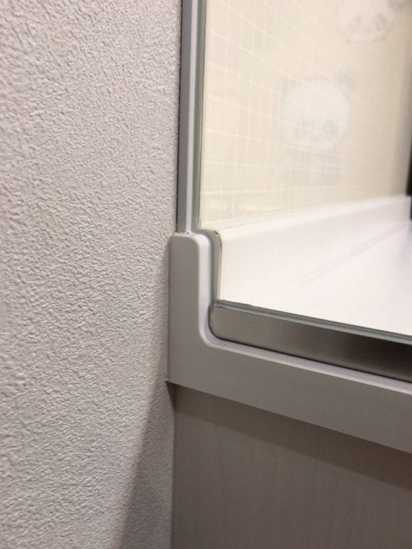 奥壁面にカウンター立ち上がりが有りますのでガラスに切欠き加工が施してあります。