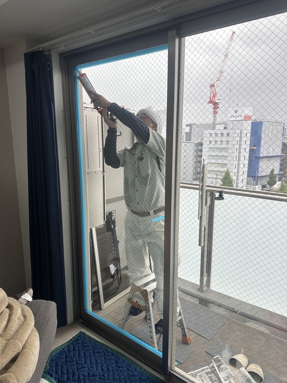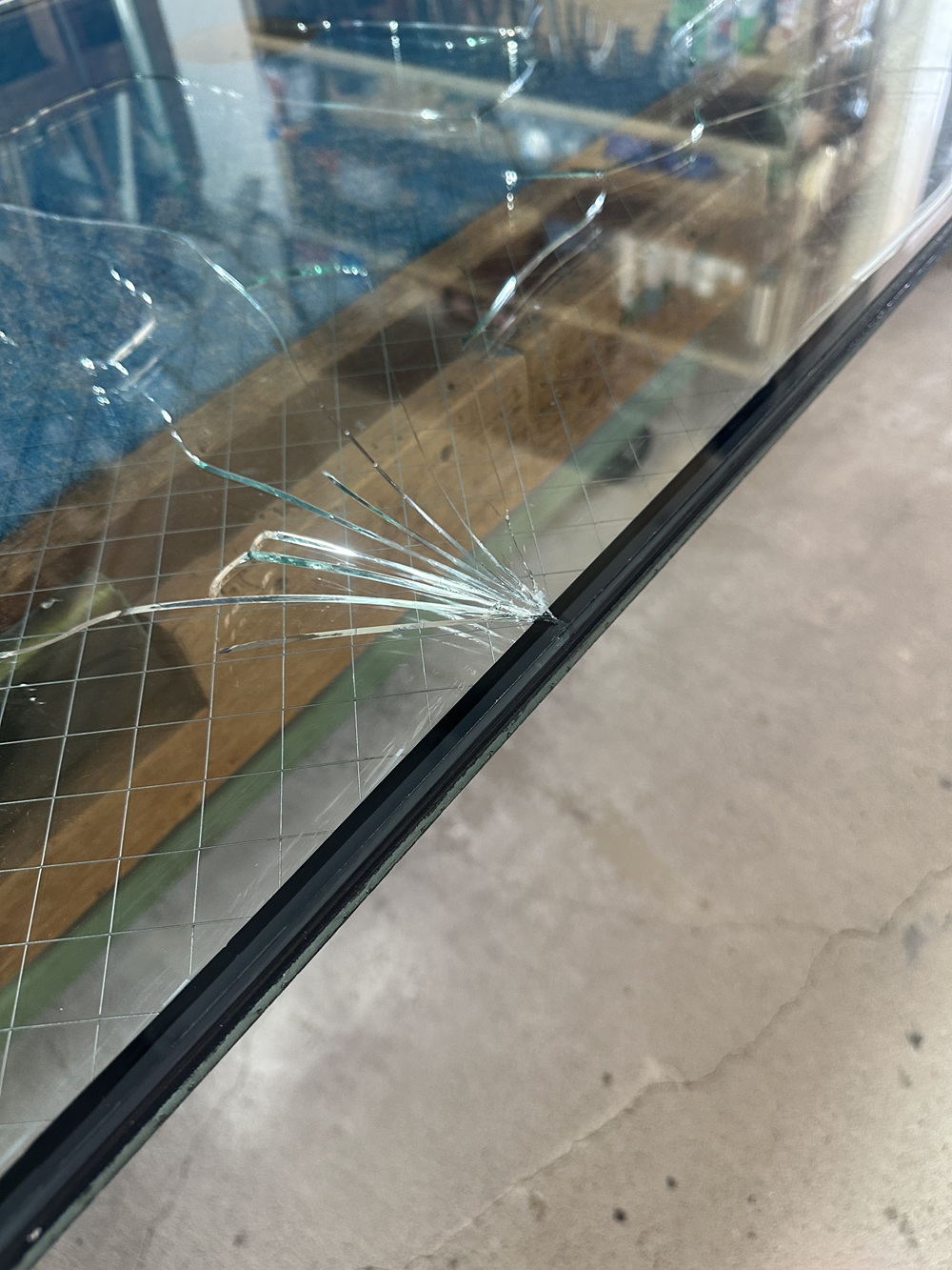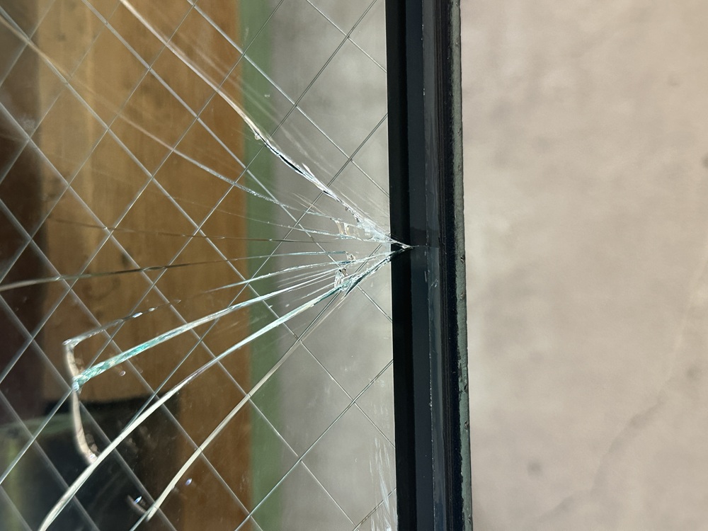 ペアガラス割れ替え修理 2025年9月30日 最終更新日時 : 2025年11月23日 garasu110 修理・施工事例のカテゴリーガラス修理 名古屋市千種区 網入透明6.8ミリ+空気層6ミリ+透明5ミリW788 X H1777 (1枚)コーキング施工 施工前 施工中 熱割れ発生部 室内側透明5ミリ 熱割れ発生部
