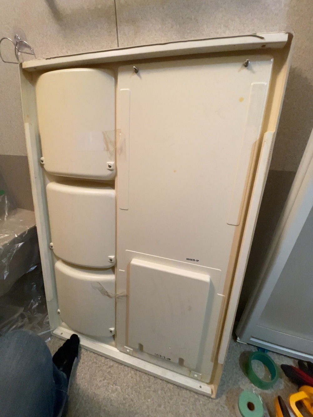 上部鏡受け金具を上にスライドして鏡を外すのですがこちらの鏡はユニットを外し裏面からナットを外す事になります。