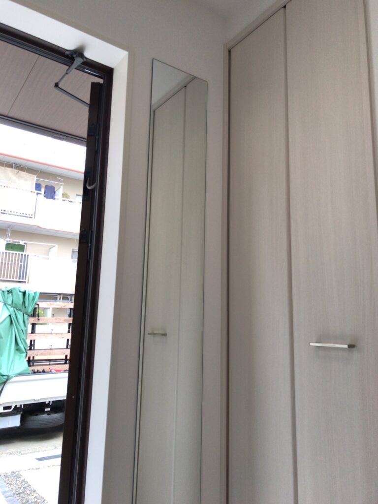 鏡取り付け 2020年10月31日 最終更新日時 : 2025年12月2日 garasu110 修理・施工事例のカテゴリー鏡取り付け・交換 名古屋市千種区にお住いのお客様より姿見鏡取り付けのご依頼をいただきました。鏡5㎜四方磨き300×2110 1枚