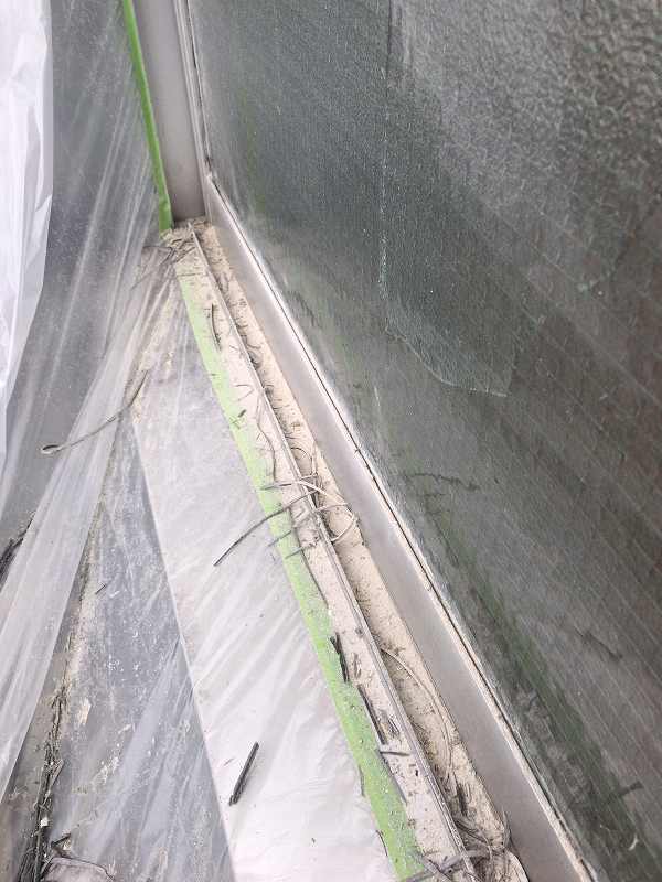 本日は雨天の為、外障子を外し内障子は建て込んだままで廻りを養生してパテをケレンする事にしました。