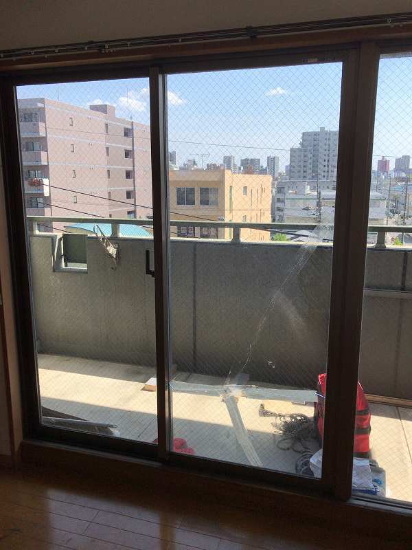 マンションベランダの掃出し引違いサッシのガラスを1枚修理に伺いました。