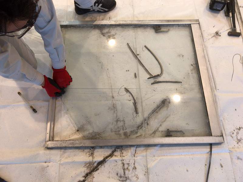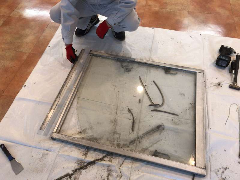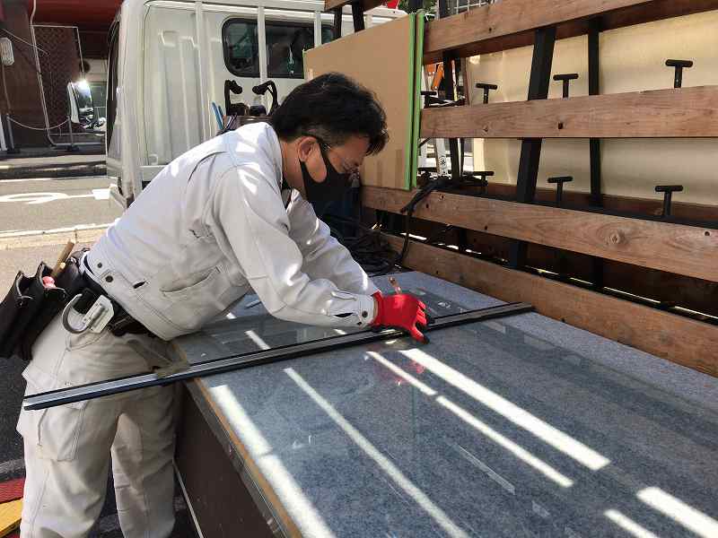 片引き窓ガラス修理 2020年4月25日 最終更新日時 : 2025年12月6日 garasu110 修理・施工事例のカテゴリーガラス修理 いつもお世話になります会社様の仕事です。古いRC造建物でアルミサッシのガラス固定にパテが施されています。一部シリコンで補修もしてありました。 外部の上框に桟がネジ止めしてあります。これを外してガラスの交換をします。 何時もの事ですが、トラック荷台でガラスを切断し嵌め込みます。