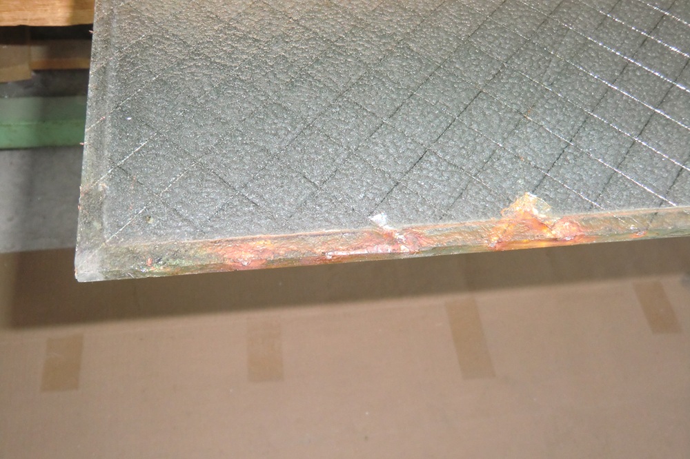 窓サッシなどガラスをグレチャン(コの字型ゴム)で施工したガラス下部の状況